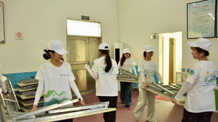 为了让孩子们有一个干净、舒适的学习环境,全体队员立即投入场地布置工作,一起搬运教学物资、桌椅,对教室进行了全面清洁与布置,打造一个良好的教学环境。