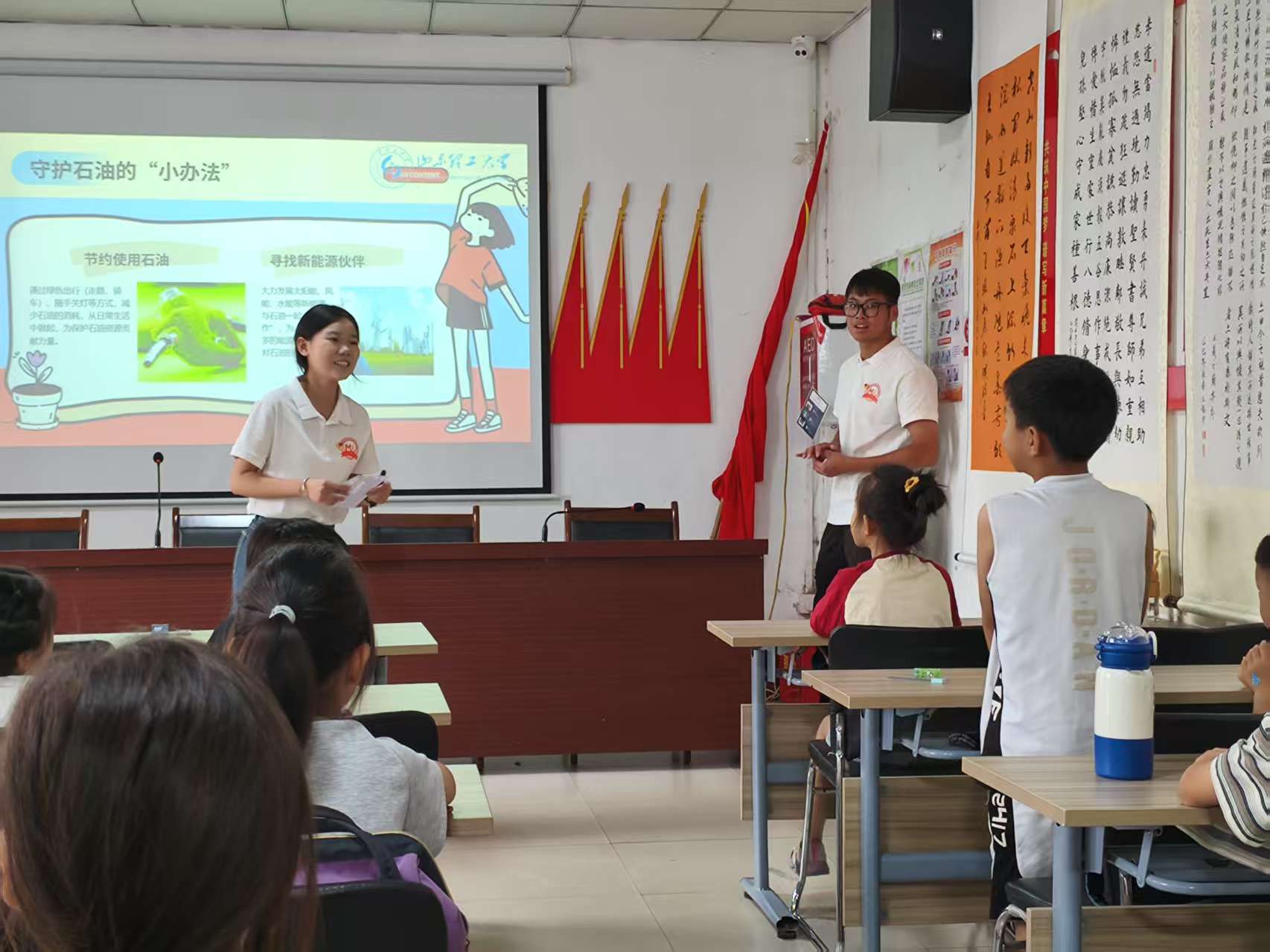随后,实践团成员王彤彤、范子龙共同主讲石油知识课程,用通俗的语言拆解专业知识。从石油的形成过程到在生活中的应用最后到当前面临的资源短缺问题,两位成员引导孩子认识石油资源的重要性,让“守护石油”不再是空洞的口号。
