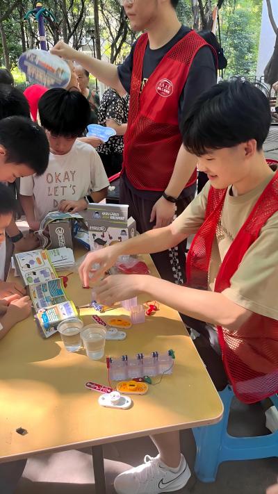 在另一片区域,另一组志愿者则面向社区中老年居民开展“家庭安全用电”宣传工作。讲解高温季节使用空调、电扇等高功率电器的注意事项,并结合真实案例说明电气火灾的成因与防范措施。临近中午,活动逐渐接近尾声。志愿者们将部分实验装置作为纪念礼物,赠送给现场的小朋友。最后,全体志愿者与参与活动的居民代表、小朋友们共同合影,完成现场清理工作后撤离,与第一队汇合,开展后续复盘。