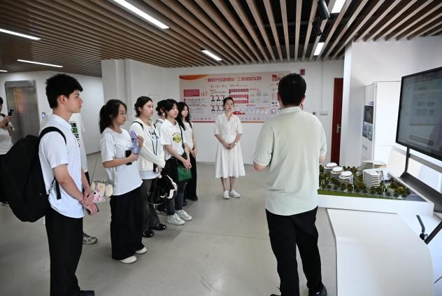 实践队首先来到福州市综合能源服务有限公司进行实地调研。队员们参观了公司展厅及相关项目现场。展厅内,一幅幅动态数据图表与实物模型,生动展示了分布式光伏、智慧储能、综合供能等多元化能源服务场景;在项目现场,工作人员详细向实践队员介绍综合能源在推动城市低碳发展中的典型应用案例与成果,讲解了综合能源系统如何通过“源网荷储”协同优化,为商业楼宇、工业园区提供低碳高效的能源解决方案,带领实践队成员直观感受到该领域在“双碳”目标下蓬勃发展与创新活力。