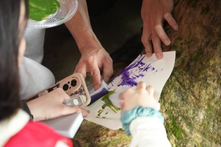 在“生态关”环节,队员们先进行示范,随后指导青年们仔细观察秋枫古树的树干纹理,选择合适位置用水彩和海绵在纸张上拓印。一张张带着古树独特纹理的拓片,成为青年们与古树之间的专属记忆,也让大家在动手过程中直观感受古树的生长密码。