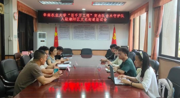 7月18日下午,文光街道88号党群服务中心二楼会议室内气氛热烈,华南农业大学古木守护队部分成员与文光街道办团委、创建办工作人员代表齐聚一堂,围绕“解密古树千年密码”线下科普宣传活动细则及文光街道绿美建设工作展开深度研讨。