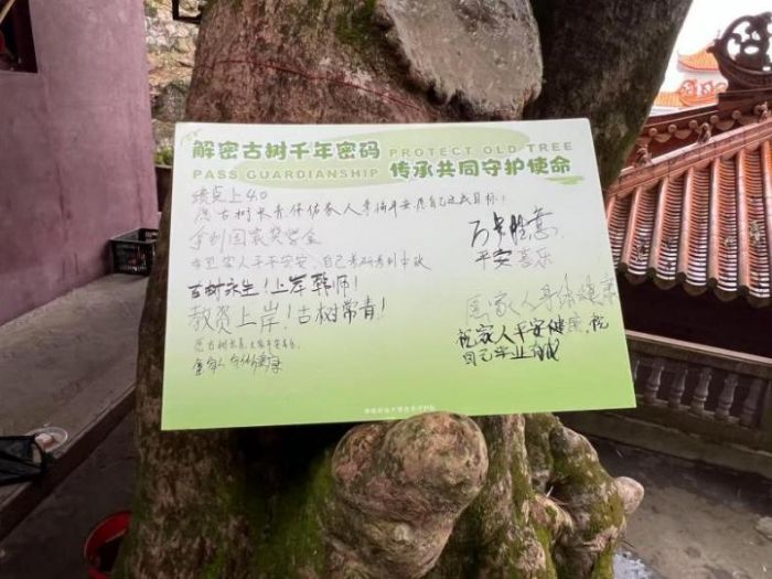 “文化关”环节则让青年们穿越时空,触摸古树承载的历史文脉。队员们生动讲述了秋枫古树与当地历史名人的关联故事,展现古树作为“活化石”的文化价值。因当地居民及访客常有在古树下祈愿的传统,活动特意准备了KT祈福板。淅沥细雨中,青年们纷纷提笔写下真挚祝愿,既有对考试升学、生活事业的期盼,也有“愿古树长青”的共同心声,字里行间满是对古树的敬畏与祝福。