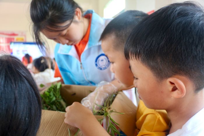 图为团队成员与小朋友挑选植物 张慧敏摄。