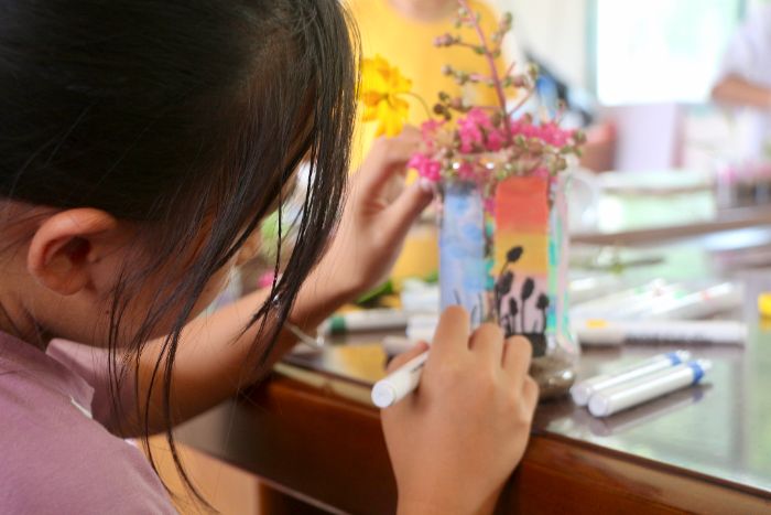 图为小朋友绘制“生态瓶”花盆 郭佳晨摄。