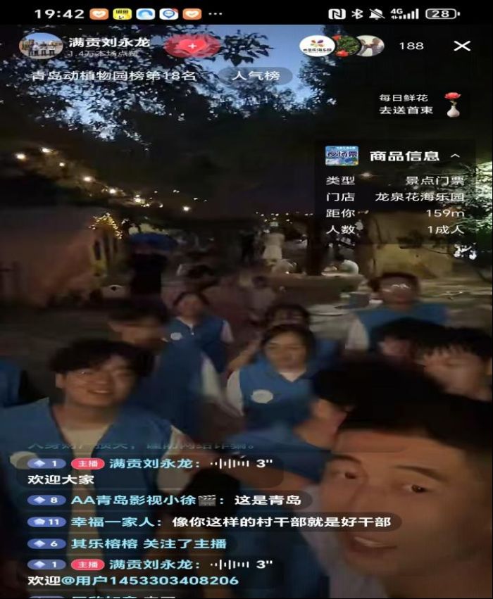 实践团的到访,为这场直播增添了一份特别的惊喜。刘书记邀请实践团成员们一同加入镜头。“来来来,朋友们,今天还有远道而来的大学生实践团来到咱们花海乐园,让他们也跟咱直播间的家人们打个招呼!”在刘书记爽朗的笑声和直播间观众热情的“欢迎”弹幕中,实践团的成员们带着几分惊喜和羞涩,纷纷凑近镜头,微笑着挥手致意。