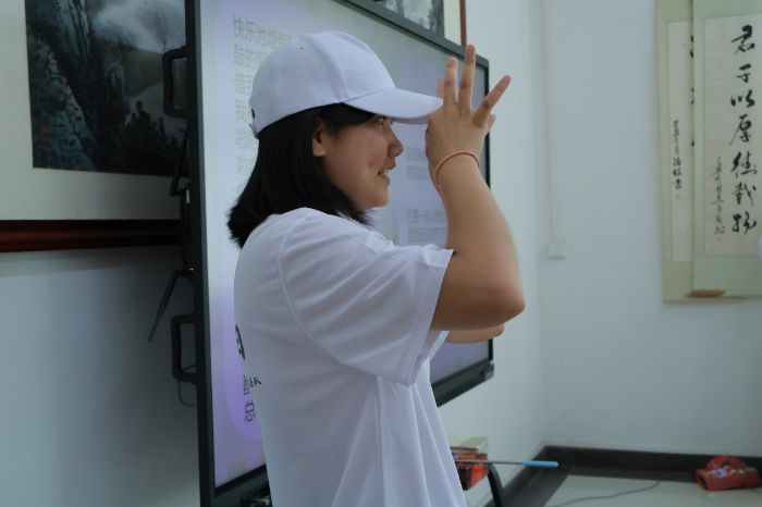 图为广东科技学院惠艺启楼突击队木木老师在为孩子们介绍客家话(李宗桓摄)
