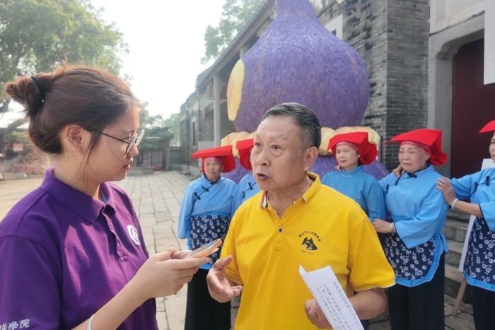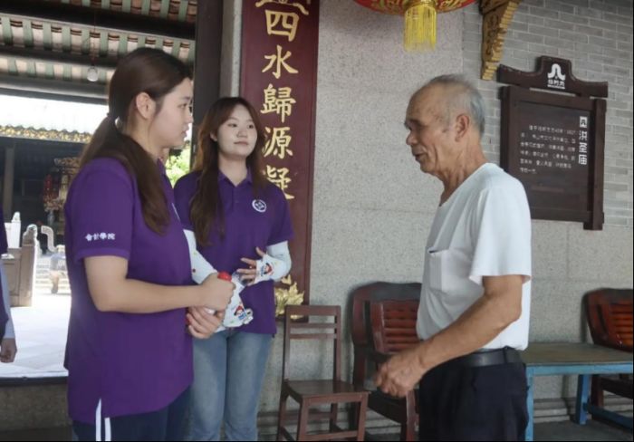三、聆听当地故事,触摸家族传承 7月9日,团队成员一同前往三水区洪秀庙进行调研,向当地村民--锐爷爷了解其姑姑作为“红头巾”赴南洋务工的往事。在交谈过程中,锐爷爷回忆道,当年为分担家庭重担,他的姑姑远赴新加坡,凭借吃苦耐劳、坚韧不拔的品质,成为当地知名的劳动者。“她那股不服输的劲头,家里人都铭记于心。”锐爷爷的讲述,将“红头巾”从历史资料中的群体符号,与一个家庭的记忆紧密相连。这种跨越时空的家族联结,让突击队成员们深刻认识到,“红头巾”精神并非抽象概念,而是融入血脉、代代相传的强大力量。