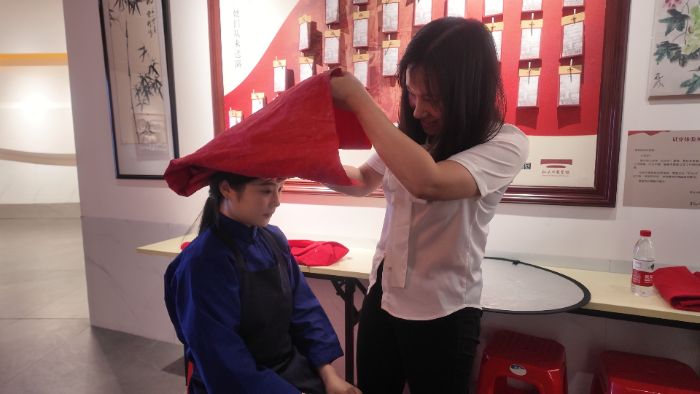 图7:红头巾展览馆内工作人员为广州工商学院缘梦公益团队突击队成员佩戴红头巾