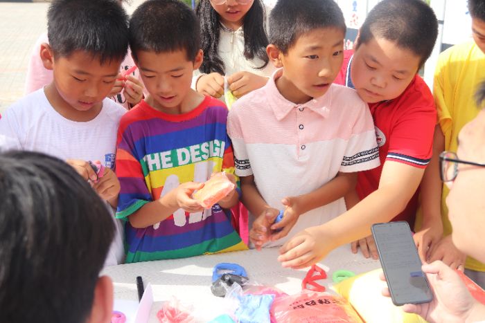 结束时,四组学生轮流展示作品:蓝染方巾上的“星空纹”、拓印布上的“自然诗”、彩泥甲骨文“家”字……每一件作品都承载着孩子们对非遗的独特理解。支教团成员岳喜霜感慨:“当孩子们兴奋地解释自己的创作灵感时,非遗不再是课本上的名词,而是他们生活的一部分。”