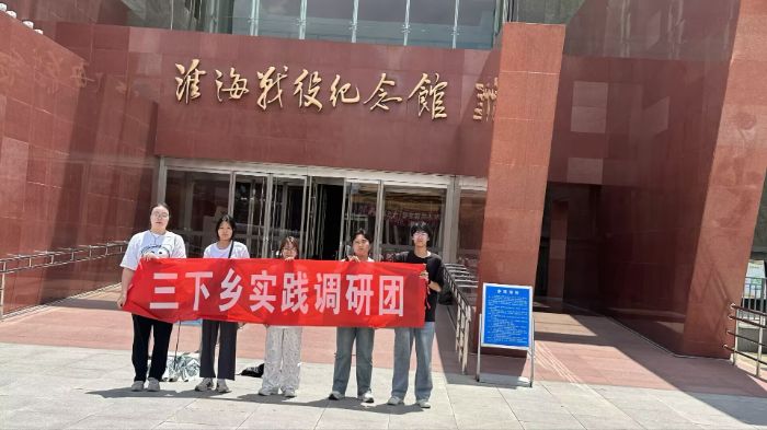 参观结束后,队员们迈着整齐而坚定的步伐在淮海战役纪念馆前,手持“三下乡实践调研团”红色横幅合影。红色的横幅与纪念馆庄严肃穆的建筑相互映衬,阳光洒在队员们年轻的脸庞上,洋溢着青春的朝气与对革命历史的崇敬。这一刻,青春的力量与红色的历史在此交汇,队员们将带着这份敬意,开启实践征程。