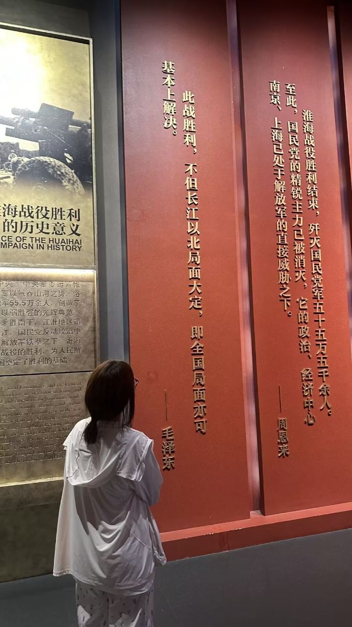 踏入博物馆,首先映入眼帘的是镌刻着“人民的胜利”的宏伟墙面。这五个大字,不仅是对淮海战役胜利的高度凝练,更蕴含着这场战役背后人民群众的伟大力量。驻足于此,不禁被那份厚重的历史感所震撼,纷纷拿出手机记录下这一庄严的瞬间.