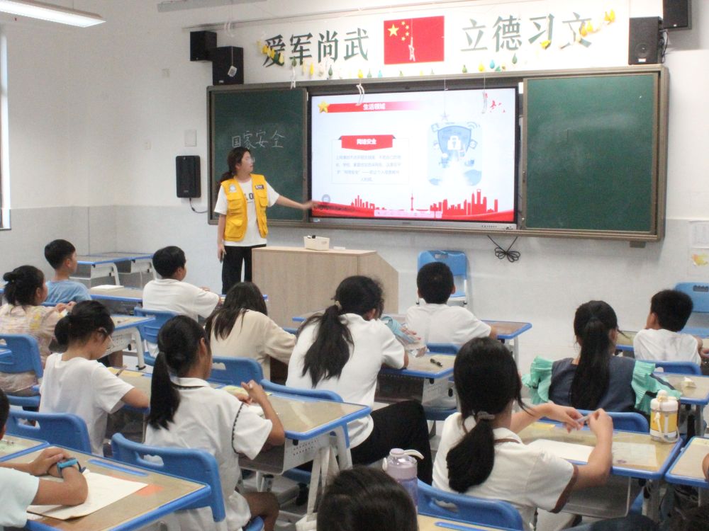 首先,支教老师通过问答互动带小朋友们认识国旗、国徽等国家象征;结合边防战士、战机守护等案例,来科普政治、国土等安全领域;借“过洋节忘传统”、“点陌生链接”等场景,明晰危害行为;最后传授“记细节、报可疑”等维护方法,还布置“升国旗行礼”、“教家人知识”等小任务,让孩子们在趣味中筑牢意识。