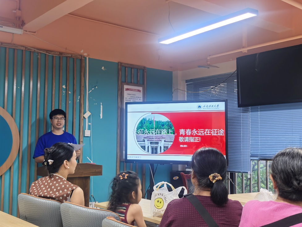 活动第二个阶段,队员陈余波以长征精神为核心为社区居民宣讲,分别就“长征精神在川西大地的生动镌刻“、”探究长征精神的内核“、”长征精神在时代长河的璀璨绽放”和“在新时代长征路上书写青春华章”等四个部分进行宣讲。宣讲过程中,居民积极互动,发表自己的看法,补充理论宣讲的局限性,使本次活动内涵更加丰富。活动最后,我们对宣讲中积极参加的居民颁发了奖品,使居民真正产生了活动参与感,大大提高了居民的活动参加积极性。使得本次长征精神汇报活动锦上添花。
