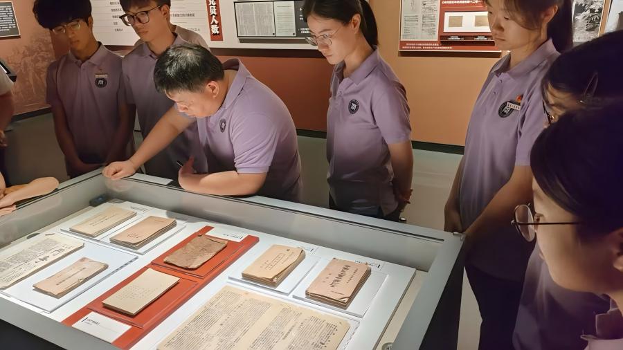 队员们在博物馆内围绕史料展板聆听讲解场景