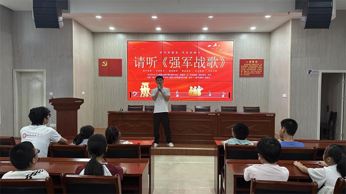 (通讯员 赵胜博 王文轩)当《强军战歌》的前奏在教室响起,一堂特殊的“音乐课”让红色信仰在青少年心中悄然扎根。7月25日,武昌理工学院人工智能学院“启元计划”星火志愿服务队走进通城县隽水镇雁塔社区,带领孩子们学唱《强军战歌》,让爱国强军的种子在青少年心中生根发芽。