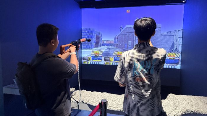 参观中,互动体验区成为队员们释放热情的天地。复古警用摩托旁,队员们接力“骑巡”,在“欲寄平安无好句,不如来此共骑巡”的标语下,模拟守护街巷的场景,笑声中藏着对公安巡逻工作的共情;射击模拟设备前,大家组队“作战”,紧盯屏幕靶标,感受警务训练的紧张节奏,切身体会警察实战技能养成的不易。这些互动,让警史学习跳出书本,变得鲜活有趣。