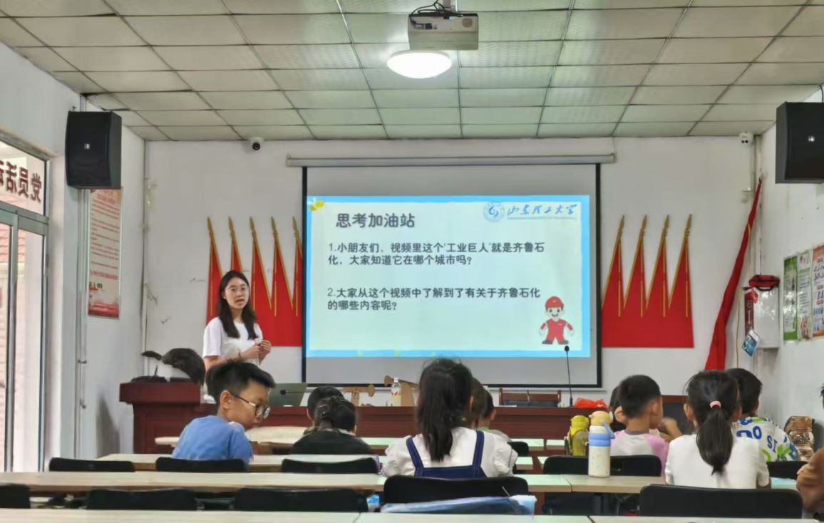 红色石油精神走进乡村课堂,实践团讲师曹孟肖、孙铭悦以石油工业发展史为主题,系统讲解"6907‘战天斗地·惟实励新’"与"齐鲁石化‘塔林丹心·能源报国’"两大精神。课程通过工程师刘长厚事迹讲述、企业创业影像展播等形式,呈现石油工人攻坚历程。将“苦干实干”、“三老四严”、 “能源报国”等石油精神的核心内涵传递给了在场的青少年,引导学生理解能源安全与国家发展的关联。