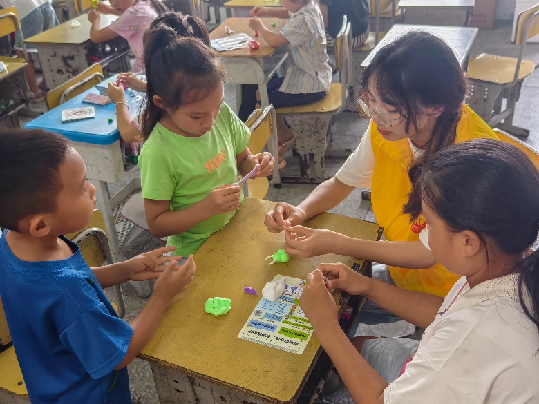 图为实践团成员与小朋友一同捏橡皮泥。麻凯摄