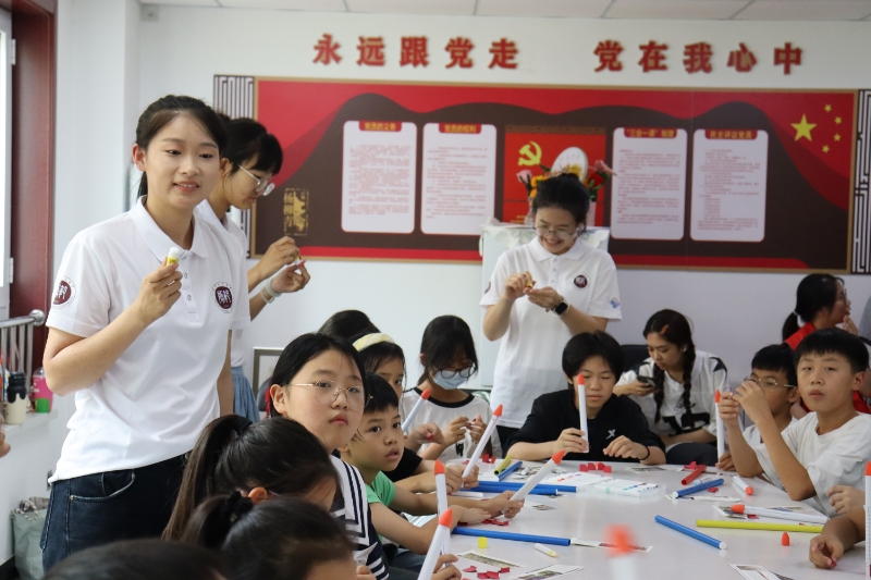 图为儿童在实践团成员指导下进行手工制作。“星语心寰”实践团摄