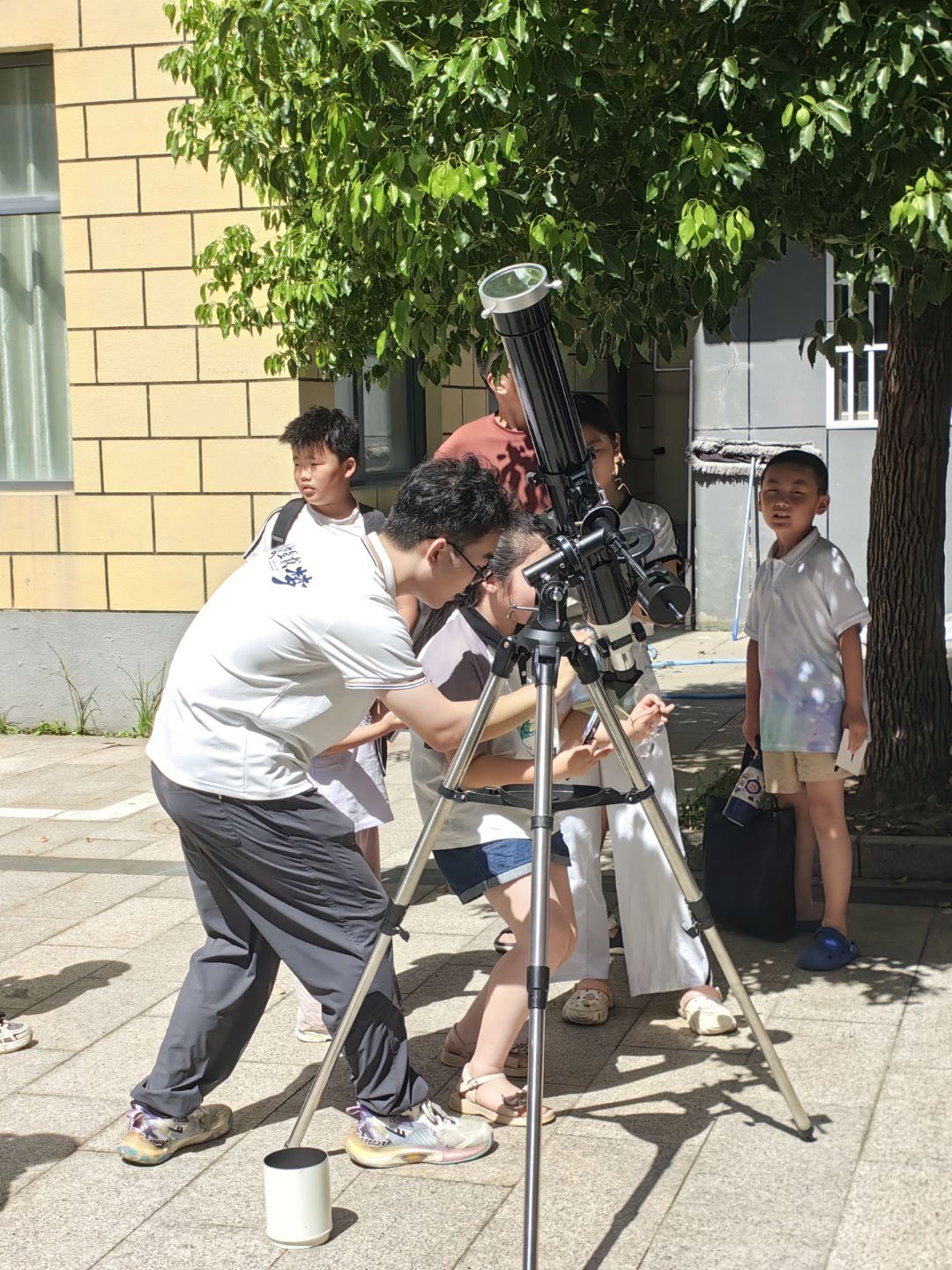 天文望远镜一亮相就成了全场焦点。志愿者先让孩子们用望远镜观察远处的树木和房屋,熟悉设备操作,随后带领大家观测太阳黑子。“观测太阳时一定要用专业滤光镜,保护眼睛很重要哦!”志愿者一边强调安全注意事项,一边协助孩子们调整设备。当清晰的太阳黑子影像出现在镜头里时,孩子们激动地互相分享:“我看到了!那个黑点一直在!”