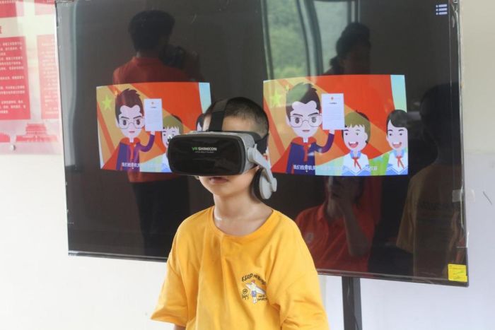 图为学生们戴着VR眼镜看家乡 郭佳晨摄。