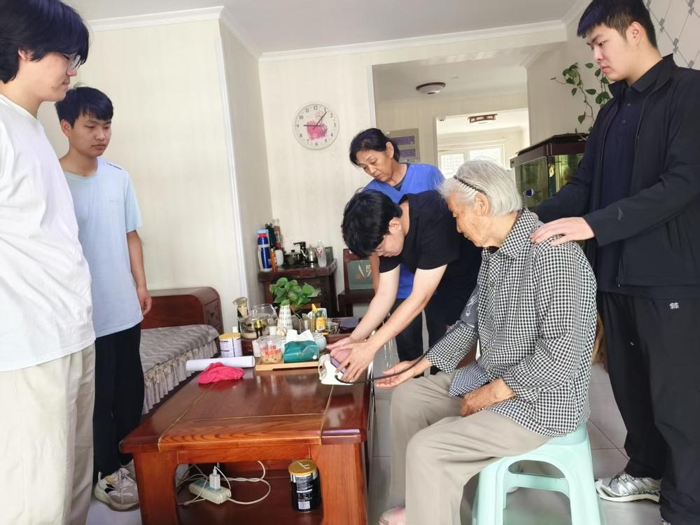 实践团成员接到关于83岁独居杨奶奶近几天常头晕的消息。在医保工作站专业人员带领下,实践团全体名成员携带血压计前往杨奶奶家,由于时间紧张,在医保工作站专业人员的指导下实践团成员分工协作以便更好的完成工作。