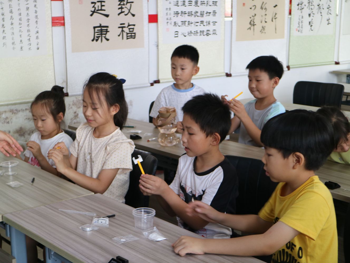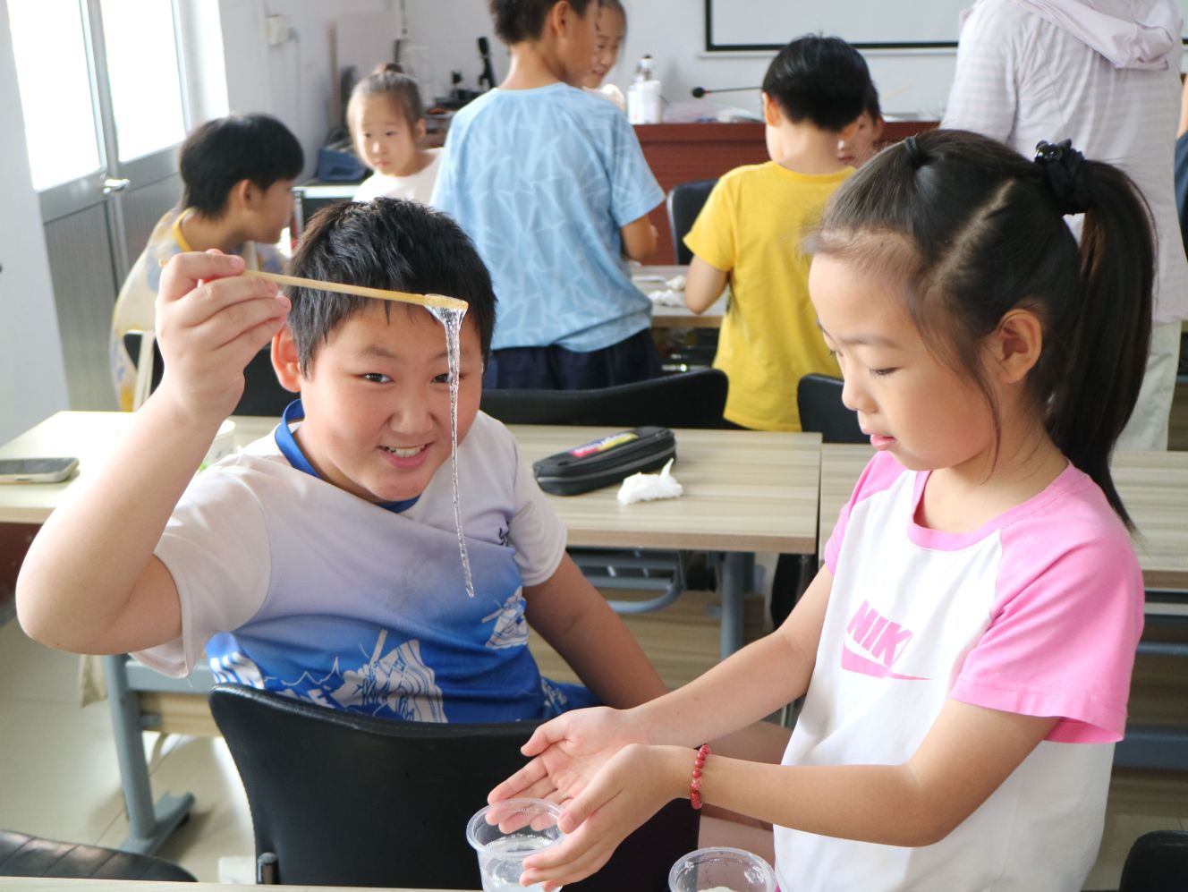 在“好玩的鼻涕虫”课程中,实践团成员范子龙使用聚乙烯醇、硼砂溶液等材料,带领学生进行实验。在讲解“如何让液体形成凝胶状”相关原理后,学生动手操作,利用材料制作出凝胶模型。实验过程中,有学生表示:“原来平时用的胶水里面就有这种物质。”制作完成后,现场传出学生的欢呼声。此次课程设计采用‘动手实践结合知识学习’的方式,旨在帮助学生理解物质变化过程。