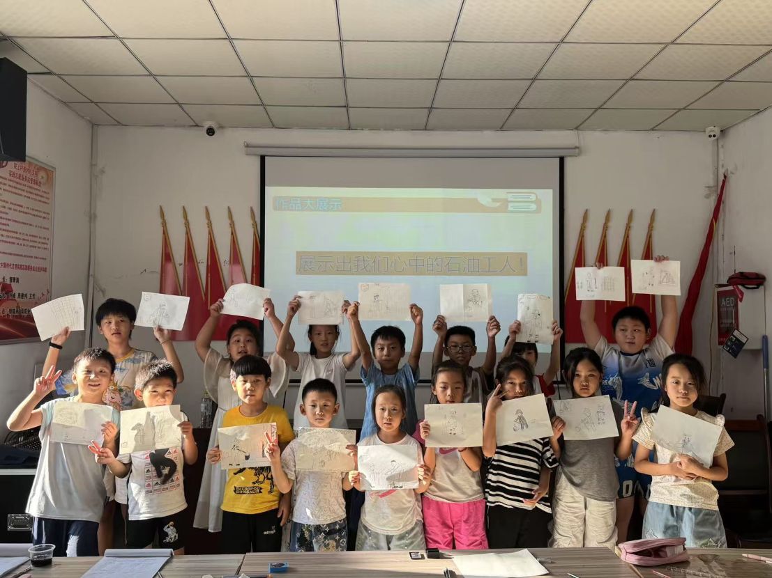 在“‘我心中的石油工人’主题绘画”课程中,实践团成员孙铭悦、曹孟肖向学生分发绘画工具,组织创作石油工人主题作品,引导学生用色彩描绘心中的石油工人形象。有的画戴着安全帽的工人在钻井平台上忙碌,有的画石油管道通向远方,每一幅作品都充满童真与敬意。