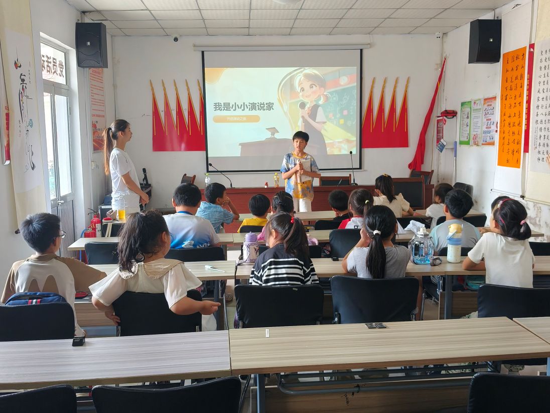 "我是小小演说家"演讲比赛拉开下午活动的序幕,实践团成员曹孟肖、孙铭悦担任评委,组织学生依次上台进行演讲,鼓励孩子们走上讲台分享自己对上午三个红色教育基地讲解的想法。