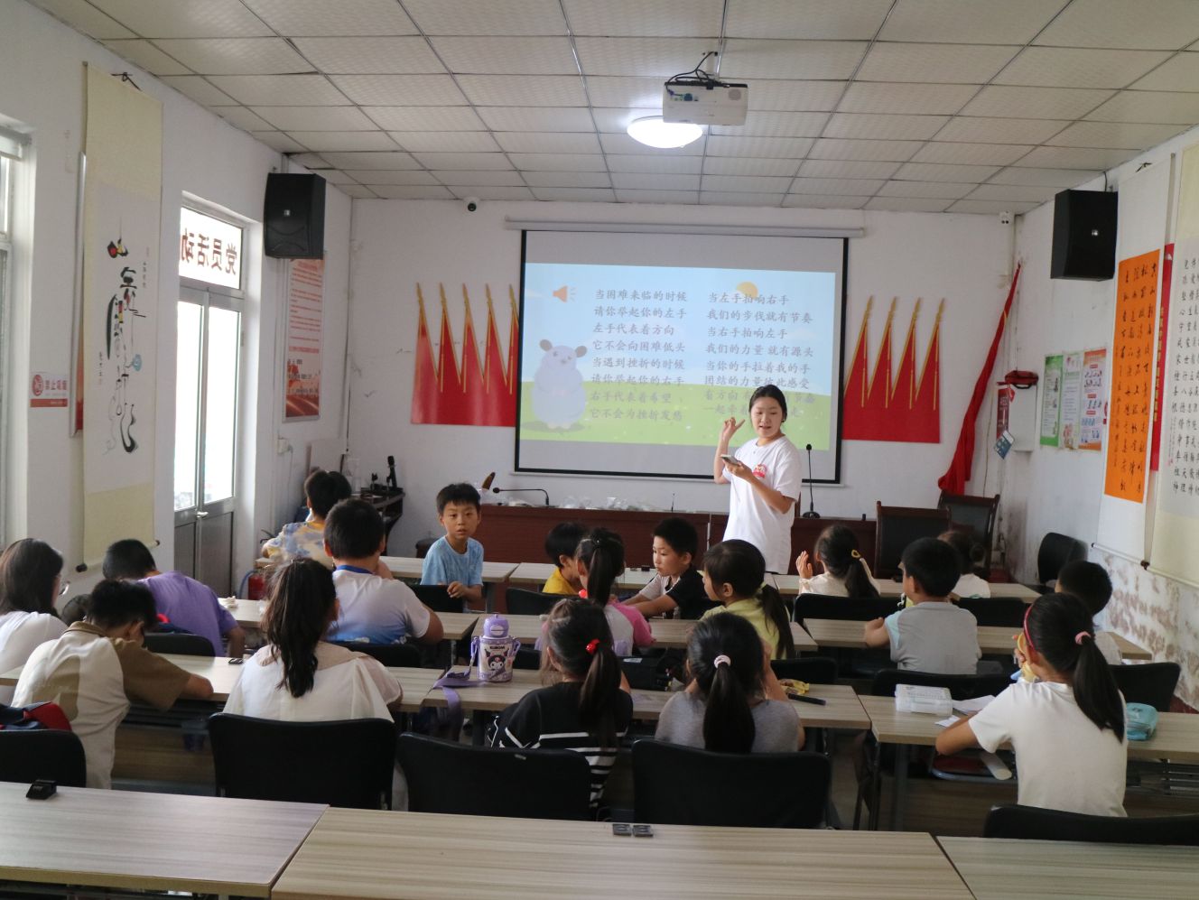 红色课程结束后,实践团成员张舒涵、曹孟肖、孙铭悦带领孩子们回顾《左手右手》这首歌。他们先播放歌曲旋律,引导学生跟着哼唱,随后为歌曲设计了一系列贴合歌词意境的动作——当唱到“当你的手拉着我的手”时,孩子们两两相握。成员们耐心讲解每个动作的要领,纠正孩子们的姿势,鼓励他们边唱边做,为后续的唱歌演出打下基础。