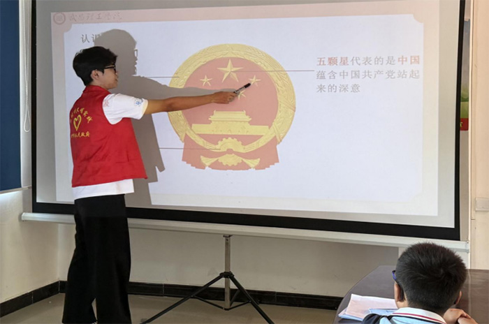 主讲老师付译可精心设计课堂,以讲解国旗、国徽、国歌知识,互动感悟红色精神为载体,引导青少年领悟国旗的意义与先辈的信仰。国旗复刻时,周美佳小朋友上台触摸星角,懂五角星连线藏团结密码,发出“每一笔都藏着大家团结在一起的秘密”的感慨。