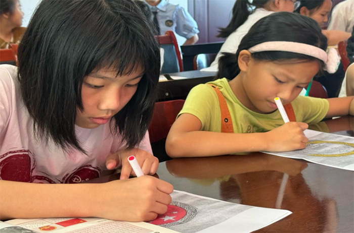 课堂尾声,付老师在白板上手绘出中国地图,用不同颜色标出宝岛台湾、南海诸岛,告诉孩子们祖国的每一寸土地都像国徽上的五星一样缺一不可。互动环节中,付老师分发出国徽图案的涂色卡,孩子们拿起彩笔,小心翼翼地为金色的齿轮描边,给鲜红的底色上色。卢语晨小朋友难掩激动,他说道:“要让国徽永远亮亮的,就像祖国妈妈的眼睛。”句句稚嫩却炽热的话语,让红色信仰跨越时空,悄然在青少年心间扎根、生长,化作爱国传承的力量。