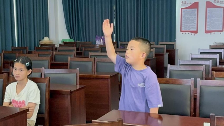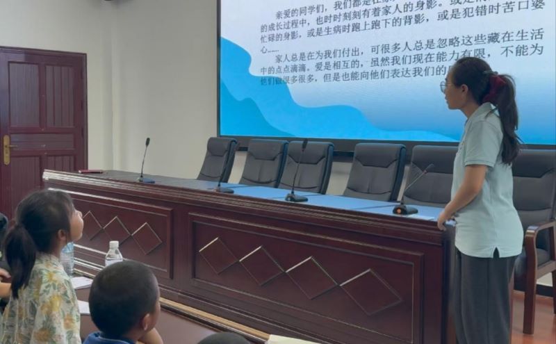 夏蝉在窗外树上喧闹着,教室里的空气也被蒸腾得格外暖热。我们三下乡团队正在合心村给孩子们上感恩教育课,教室里偶尔传来几声低低的啜泣——一个男孩正对着手机屏幕里父母的面庞,耳朵和脸颊早已因为羞涩而泛起了红晕,仿佛这小小荧幕两端,系着山峦般沉重的思念。