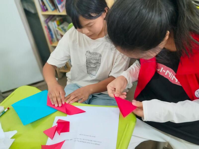 巧做创意手工,锻炼动手能力 情绪的掌握固然重要,但动手的能力也必不可少。实践队员精心设计了一场创意手工活动,让孩子们在指尖的灵动中感受创造的乐趣。活动现场,实践队员先为孩子们分发彩纸,一边演示一边细致讲解折剪的技巧。随着一声“大家动手试试吧”,孩子们纷纷投入到属于自己的“创作时间”:他们有的拿起彩纸,指尖翻飞间折出一艘艘带着童趣的小船和飞机;有的巧妙利用不同颜色的折纸,拼贴出一件件充满巧思的“特色服装”。制作过程中,实践队员穿梭在孩子们中间,时而俯身示范难点,时而轻声解答疑问。孩子们个个神情专注,眼神里闪烁着对创作的热情。此刻,他们仿佛都是小小艺术家,用双手将心中的世界一点点勾勒成形。