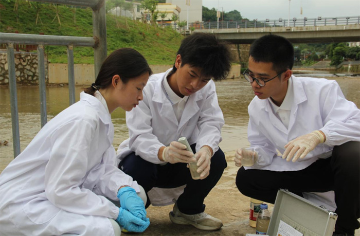 图3 “碧水环行”突击队在当地河流采集水样检测