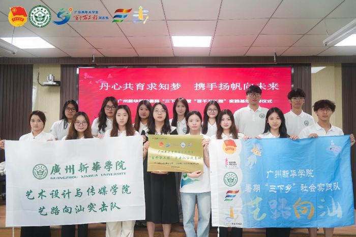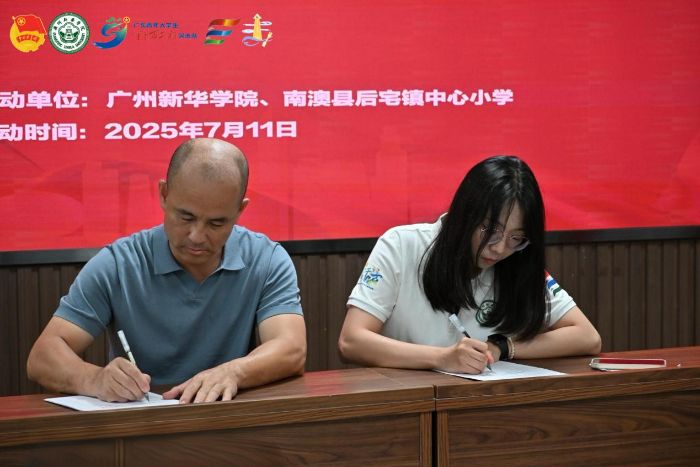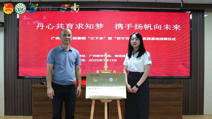 为深入贯彻落实广东省"百县千镇万村高质量发展工程"决策部署,推动乡村振兴与教育帮扶深度融合,2025年7月11日,广州新华学院与南澳县后宅镇中心小学共建的广州新华学院暑期“三下乡”暨“百千万工程”实践基地挂牌仪式在南澳县后宅镇中心小学隆重举行。此次挂牌旨在深化校地合作,深化基础教育帮扶工作,助力乡村振兴,为乡村教育发展注入新动力。