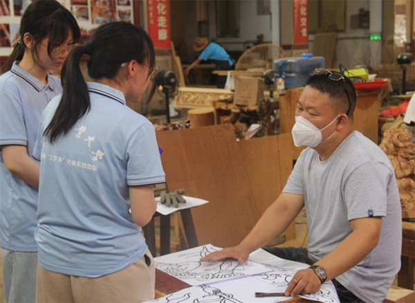 木雕古韵浸乡野,青年聚力兴潘山。团队深入东石镇潘山村,调研木雕文化的普及率与产业影响力。走访中发现,木雕技艺在村里有着深厚的历史根基,从传统民居的雕刻装饰到村民的就业选择,非遗元素已深度融入乡村生活。摄影组拍下了村落中与木雕相关的建筑与装饰,生动展现出木雕文化与乡村社会的紧密联系。政府的非遗工坊扶持、文旅项目培育等政策,也为产业发展提供了制度支持。之后,团队与潘山村村委会展开专题交流,梳理总结前期调研中发现的非遗产业发展问题。带我们参观了村落全貌后,村委会书记在访谈中指出,年轻人,尤其是大学生,是当前乡村振兴的关键因子。“我想乡村振兴还是要这一块……农村最缺的就是引进来的人才,还有本土的。现在只有让年轻人动起来了,社会才有希望。”如同书记说的,成员们也思考了对应的解决方案;为鼓励更多年轻人回潘山村发展,可联合当地企业推出“青年木雕人才计划”,提供免费技艺培训和创业扶持,如减免初期厂房租金、提供小额贷款担保;还可打造“木雕主题乡村创客空间”,引入电商运营、新媒体推广等配套服务,帮助年轻人将木雕技艺与现代商业模式结合,实现多元发展。