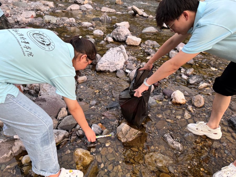 图为实践团成员清理河道垃圾。谢佳芯摄