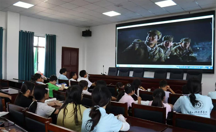 在影片结束之后,支教老师请小朋友们说出自己的观影感想。小朋友们纷纷表示影片中的战士们英勇顽强,不怕牺牲。是自己的榜样。要向战士们学习。