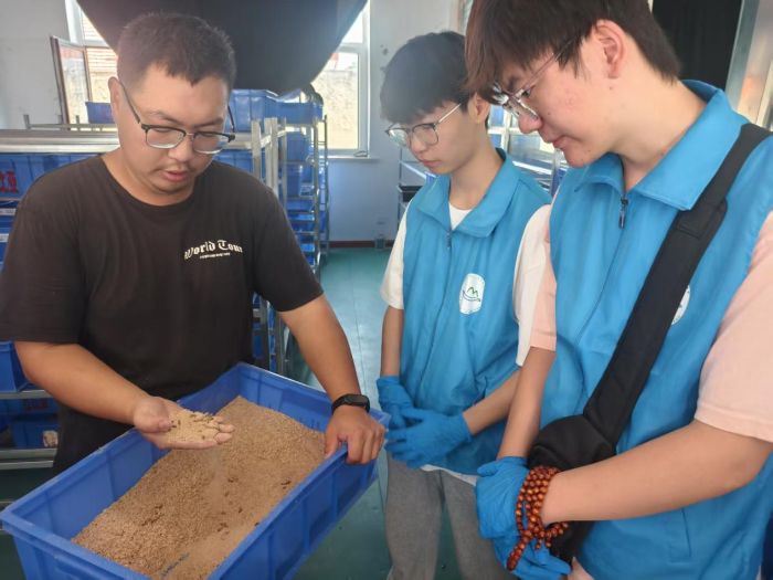 异虫培育是爬宠食品产业中的一个重要环节。技术人员向实践团成员解释,异虫培育即将异虫培育至完全变态,技术人员以目前企业培育的主要品类大麦虫为例详细介绍了异虫的生长环境、繁殖技术等方面的知识。在饲料方面,大麦虫的培养以麸子和蔬菜的混合物为主,营养配比经过专业调配以满足其生长需求。值得注意的是,大麦虫体质较脆弱,对生长环境要求极高,必须保证无毒无菌,因此培育场地需要定期进行严格的消毒杀菌,确保环境达标。目前,这些培育成熟的异虫已投入生产销售,受众群体主要为宠物食品领域。实践团成员们亲自参与了异虫的日常管理工作,如喂食、清洁和观察生长情况等。通过实际操作,成员们不仅学到了专业的养殖知识,还培养了自己的耐心和责任心。