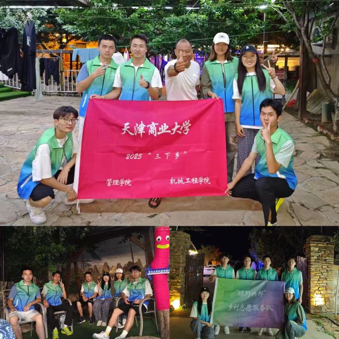 这是天津商业大学管理学院与机械工程学院联合组成的实践团队,在2025年“三下乡”活动中与农家院网红老板的合影。