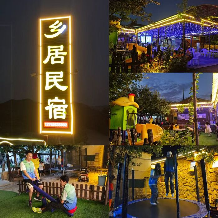 画面中,“乡居民宿”的霓虹招牌在夜色中格外醒目,散发着温馨的光芒,仿佛在热情地邀请着每一位向往乡村生活的游客。农家院内,精心布置的休闲区域被绚丽的彩灯环绕,营造出梦幻般的氛围,让人仿佛置身于童话世界。儿童游乐设施色彩鲜艳、造型可爱,为孩子们打造了一个欢乐的天地。同时,还有供游客放松身心的休闲设施,人们可以在这里尽情享受休闲时光。这些元素共同构成了一个集住宿、休闲、娱乐于一体的理想乡村度假之所,展现出农家院独特的魅力与活力。