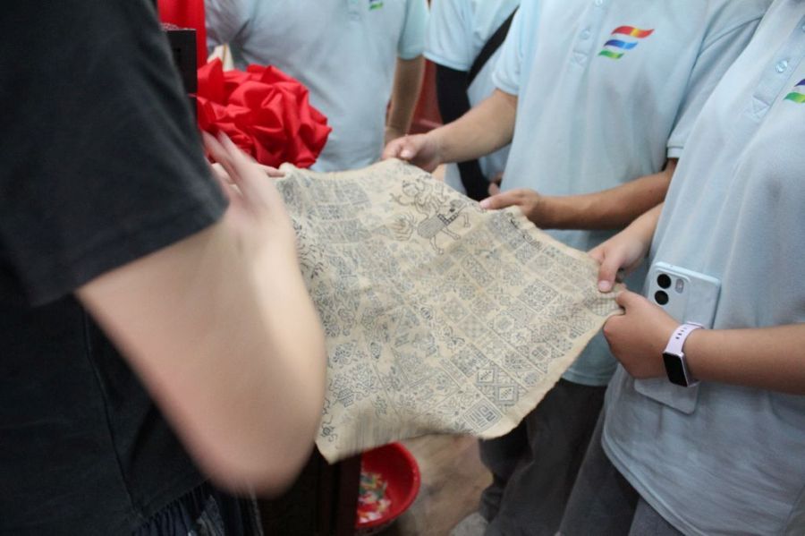 “这花母子,是无数绣娘传下来的活档案。”非遗传承人姚江莲女士将一卷泛黄的绢布在实践团成员面前缓缓铺开,轻声介绍。作为嫁花的图样模板,绢布上的花鸟、鸳鸯、吉祥结等纹样,每一处细节都凝结着岁月的打磨,牡丹花瓣的弧度必贴合自然肌理,喜鹊尾羽的层次需显灵动之姿,就连叶片的脉络走向,都兼顾着审美意趣与吉祥寓意。