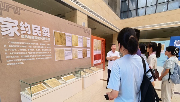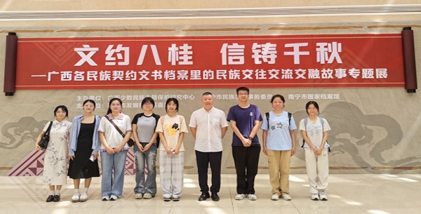 此次调研行动正逢“文约八桂 信铸千秋——广西各民族契约文书档案里的民族交往交流交融故事专题展”,成员们从该展览中探寻壮族古籍踪迹,感受壮族文字在广西各民族契约文书档案里留下的绵长气息。