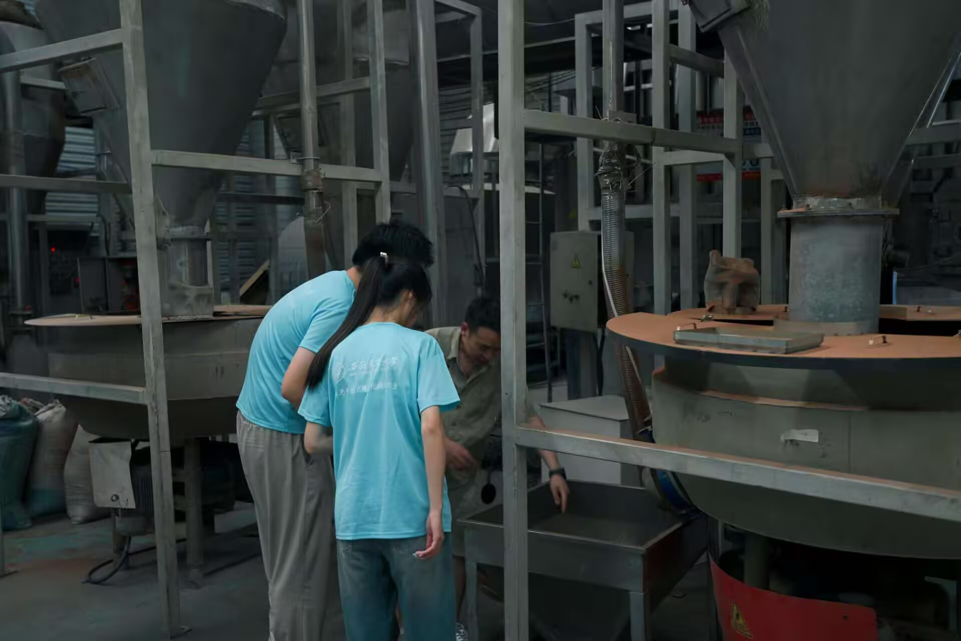 图为森泰负责人带领团队成员参观生产车间图
