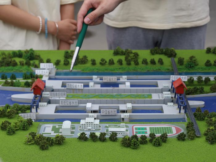 实践团首先与企石枢纽宣传部部长展开交流。宣传部部长以枢纽沙盘模型为切入点,结合观测现场的工程实景,系统介绍项目核心信息——作为平陆运河三座梯级枢纽中的“中段关键”,企石枢纽坐落于广西灵山县陆屋镇企石村,其核心通航设施为双线5000吨级省水船闸,300米×34米×8米(有效长度×宽度×最小门槛水深)的船闸尺度,搭配27米的最大运行水头,可满足大型货轮江海直达需求。整个船闸由上闸首、闸室段、下闸首及三级省水池构成,总混凝土浇筑量达249万立方米。