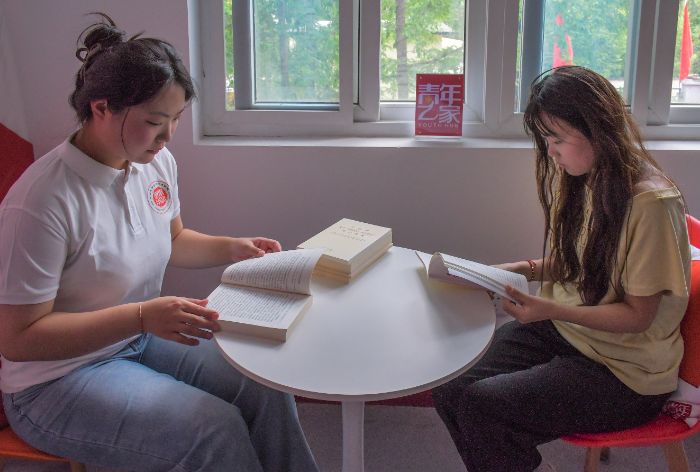 图为实践团成员研读红色书籍 殷子茜通讯员摄