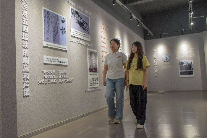 图为实践团成员浏览徐州地区人民对五四运动的响应和声援 殷子茜通讯员摄