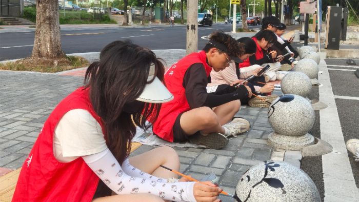 街头石墩旁,队员们身着红马甲专注创作,以笔为媒,让文明悄然浸润城市角落,用青春色彩点亮社区颜值,绘就共建美好家园的生动图景。